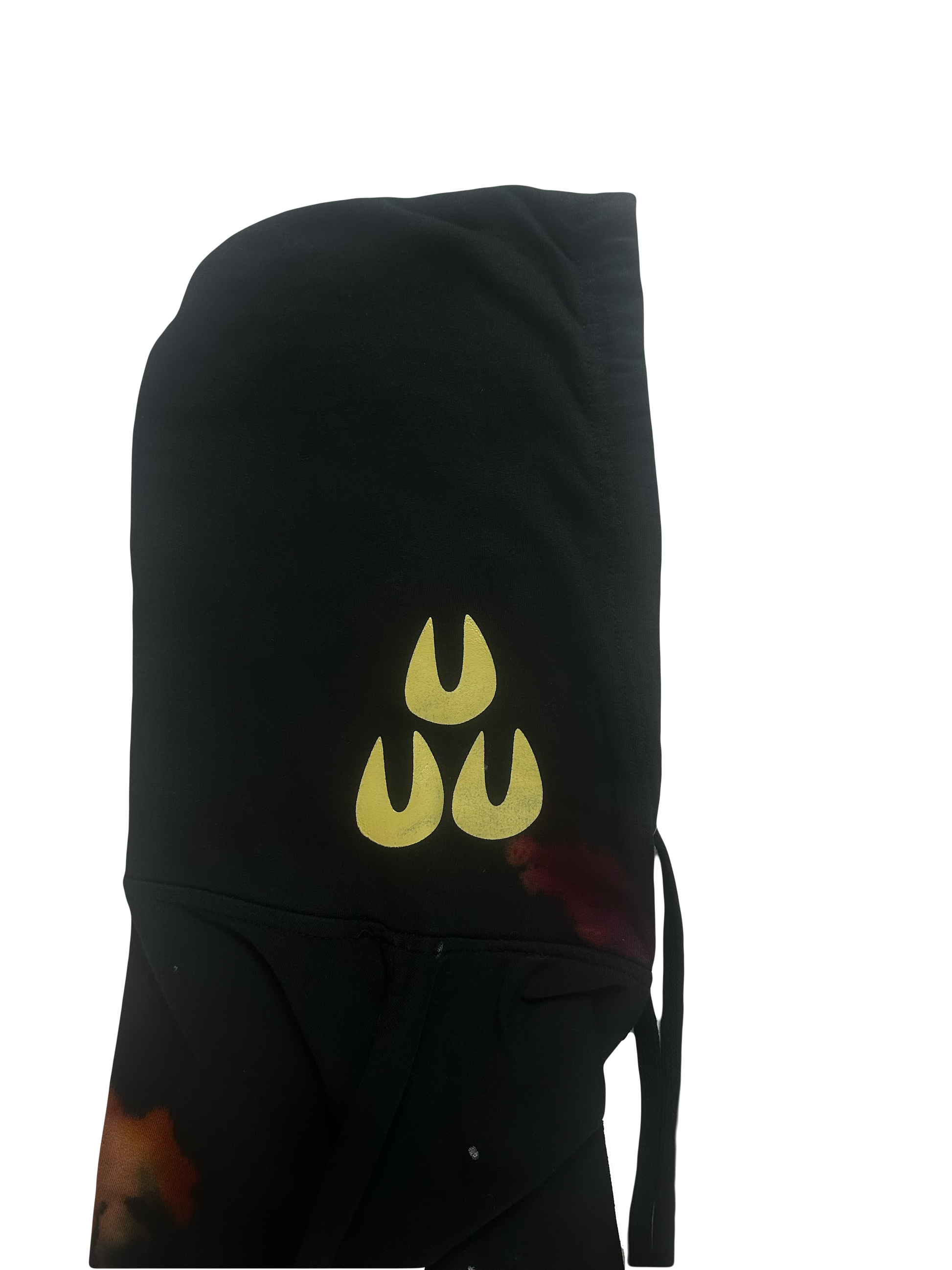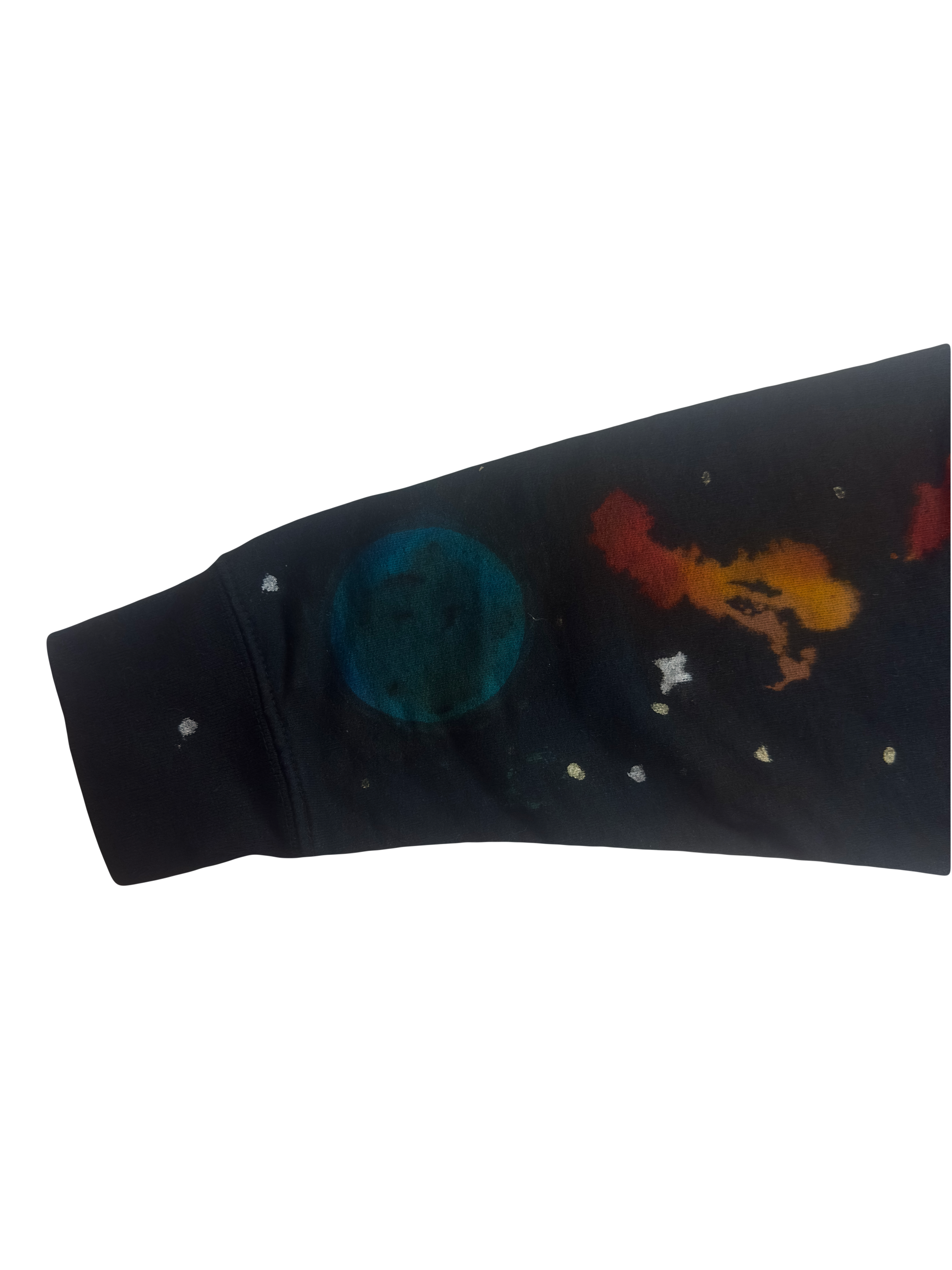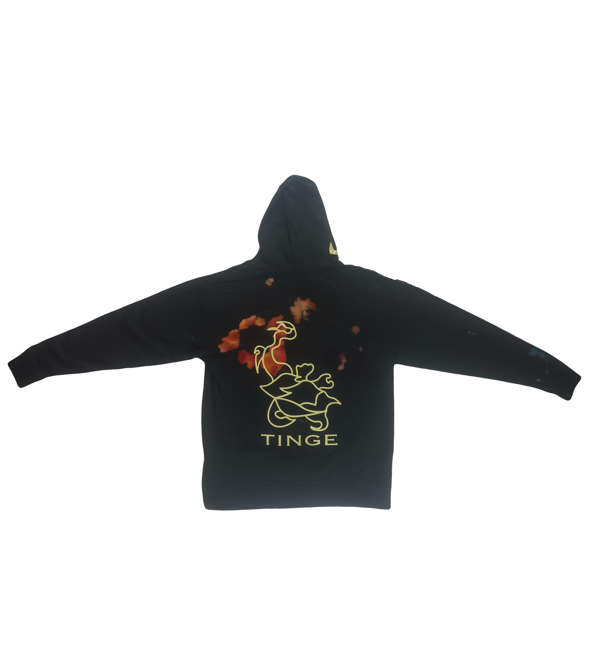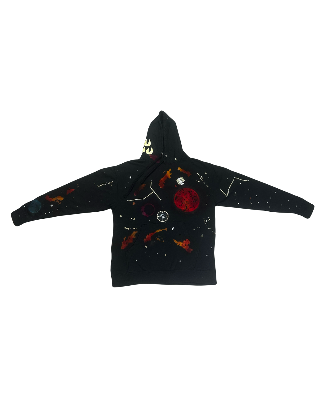 This is the next installment of the Stellar Series a subset of the Cartography Series. As the name and style suggests this piece is inspired by the night sky featuring custom dyed planets, acrylic painted constellations and stars cured and heat set to last, the signature Tinge logo on the back, ancient armor detailing on the hood and the Tinge compass inspired patch just above the pocket